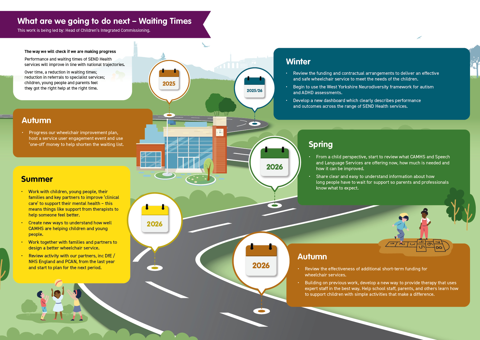 - The partnership should work quickly to improve its plans to reduce waiting times and then make it happen. The waiting times to focus on are therapeutic services (please see above); Child and Adolescent Mental Health Services (CAMHS) and access to wheelchair services.